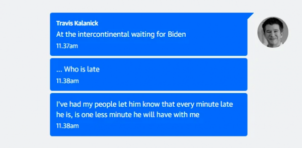 在和拜登见面时,拜登迟到了, Uber 的高管还用威胁的口气说: 他每迟到一分钟,在一起的时间就会少一分钟。