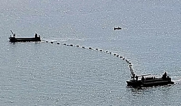 在河面上拉"阻绝链"的台陆军两栖舟桥车 图片来源:"联合新闻网"