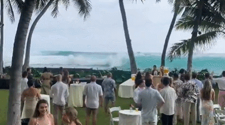 直到巨浪逼近海堤,一些人开始后退。几秒钟后,撞击到海堤的巨浪越出,吞没了用花卉装饰的桌子,并带着桌椅砸向宾客。根据视频,宾客们争先恐后地寻找庇护,一些人惊呼了起来,还有人难以置信地反复念着脏话。