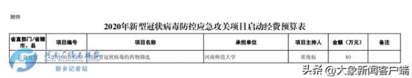 2020年1月,由河南师范大学作为项目承担单位,常俊标教授作为首席科学家的河南省新型冠状病毒防控应急科研攻关项目"抗新型冠状病毒的药物筛选"获得河南省科技厅立项;