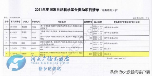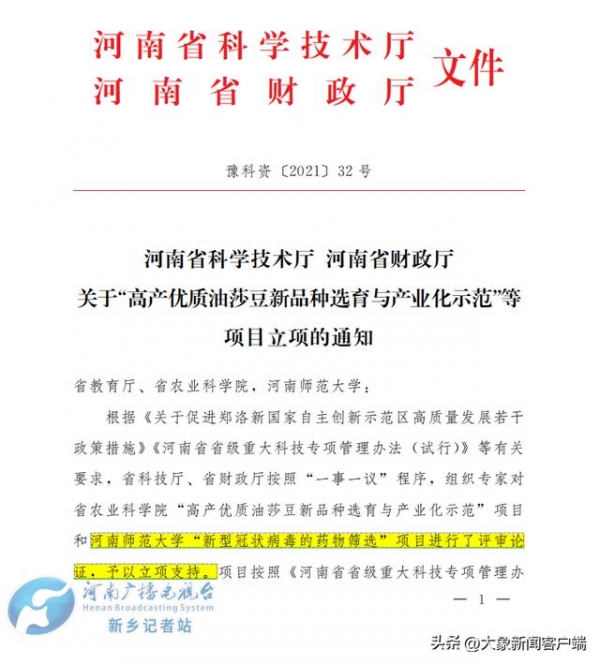 2021年6月,河南省科技厅以河南省重大科技立项支持常俊标教授继续开展"抗新型冠状病毒的药物筛选"科研攻关;