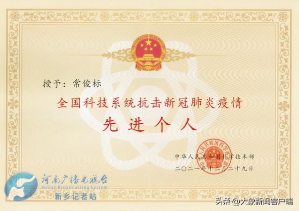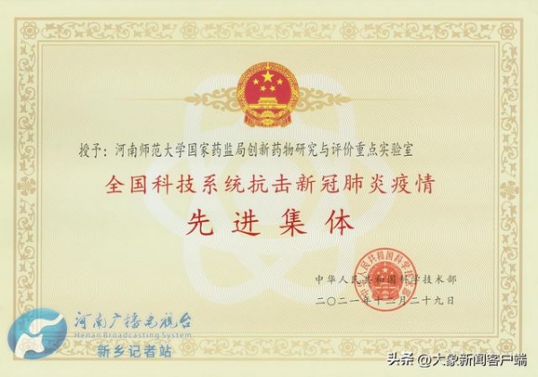 凭借在抗新冠肺炎药物研发中的突出表现,常俊标教授荣获"全国科技系统抗击新冠肺炎疫情先进个人",河南师范大学国家药监局创新药物研究与评价重点实验室,也荣获"全国科技系统抗击新冠肺炎疫情先进集体"。