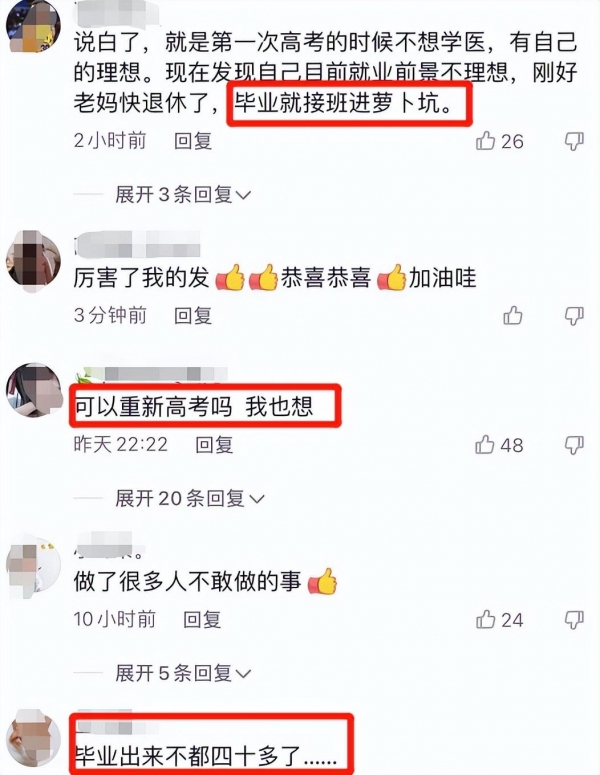 但没成想评论区却变了味,有的网友直言表示:这是看自己就业前景不理想,想着接父母的班被,又是个"萝卜坑"?还有的网友直言:医学毕业后最起码也要到40岁了,这又是何必呢!还有的网友表示:早寻思啥了!