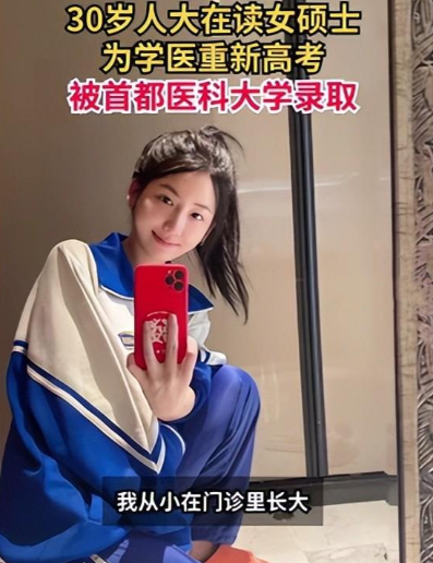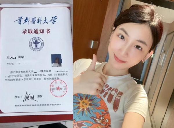 这位女生姓纪,是中国人民大学的传播学在职研究生,本科是中国农业大学的工商管理专业,但她心里却一直有个"医生梦",而30岁的她在家人的支持下,重新参加了高考,并且被首都医科大学的临床医学专业正式录取。