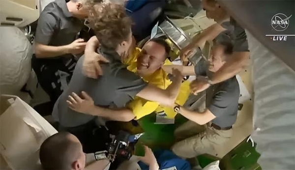今年3月18日,当搭载三名俄罗斯宇航员的俄"联盟号"飞船与国际空间站完成对接后,驻扎在空间站的七位同僚们向他们送上热情的拥抱。