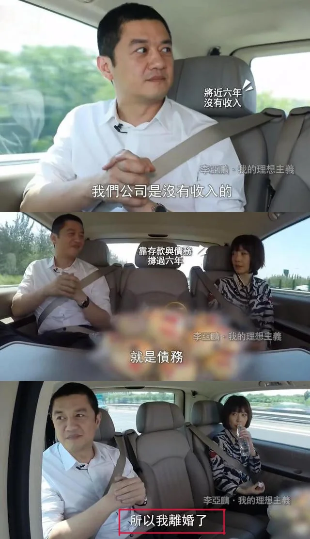 2018年,李亚鹏接受鲁豫访谈时曾透露,自己将近6年的时间内,公司没有收入,靠积蓄和债务度日。被问及"害不害怕?"李亚鹏脱口而出:"所以我离婚了"