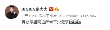 事故发生后,演员吴卓羲和主持人张大大都在社交平台发文为两位伤者祈福。