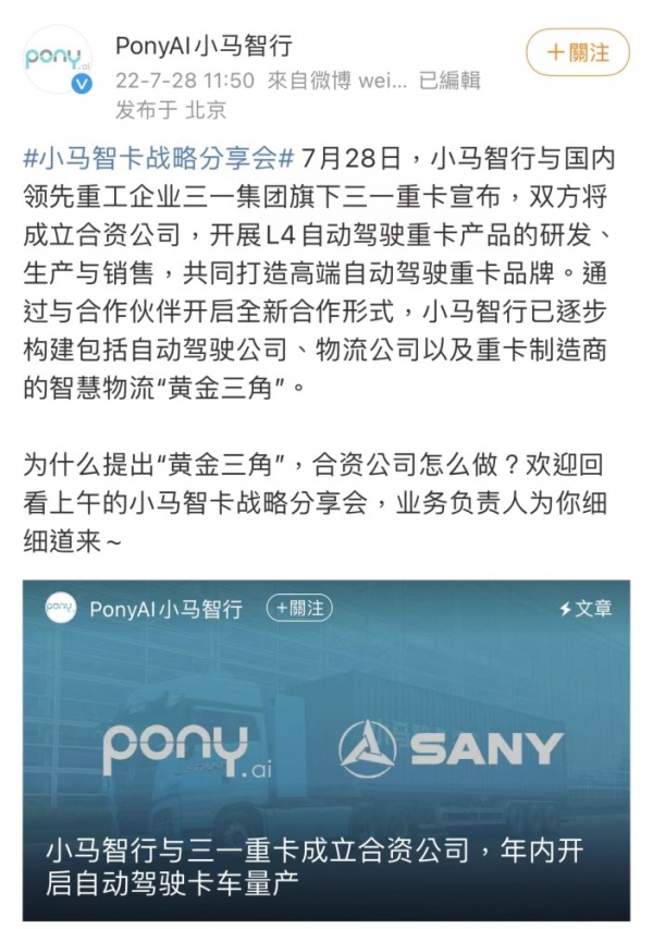 7月28日,小马智行与三一集团旗下的三一重卡联合宣布将成立全新的合资公司,开展L4级自动驾驶重型卡车的研发、生产与销售,重点打造高端的自动驾驶重卡。