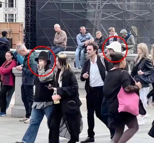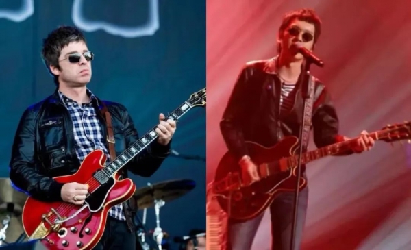 遮住脸,很难分辨出小乐和绿洲吉他手Noel Gallagher。