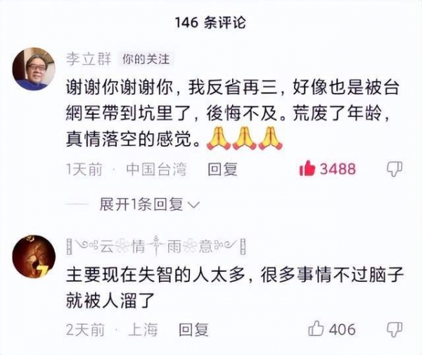 就在几天前,有影迷发视频声援李立群,而看到视频后的李立群特别感动,不仅留言致谢影迷,同时还表示自己正在认真反省,后悔当时不该接受台媒的采访,被带到坑里有一种荒废了年龄,真情落空的感觉。