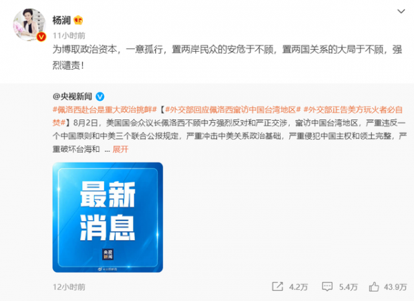 圈内的艺人们也在社交平台上第一时间转发了"只有一个中国"的话题词,表达出了自己的态度。