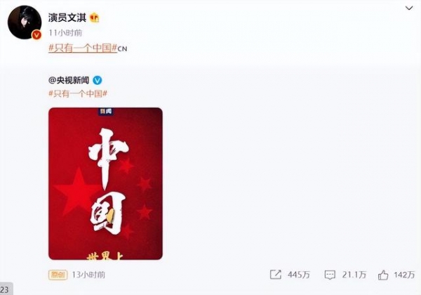 台湾女演员文琪也是第一时间转发了该条推文,并且配文"CN",体现了其坚定的爱国信念。