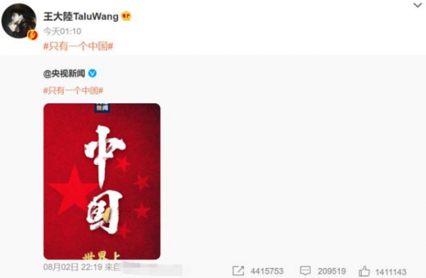 台湾演员王大陆也是凌晨及时转发,着重陈述了"只有一个中国"的坚定立场。