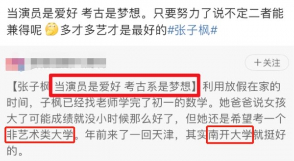 早在她还在读高中的时候,很多事就已经埋下了伏笔。那时候的她还很单纯,对于高中学习的难度完全没有概念。所以,她的爸爸理所当然地在记者面前讲述她当时的想法:当演员是爱好,考古才是梦想,希望考一个非艺术类的大学,南开大学就挺好。