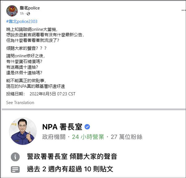 5日上午,又有基层警察向该账号投稿,抱怨昨夜系统瘫痪后,台湾警方没有实质性补偿,炮轰台湾警政署"能不能真正的做点事","警政署真的离基层好远好远"。