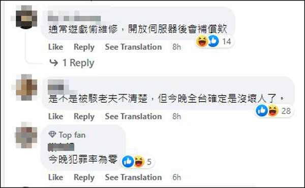 评论区则有人称"一般游戏服务器维修系统会有补偿","看来全台湾今晚是没有坏人了"。