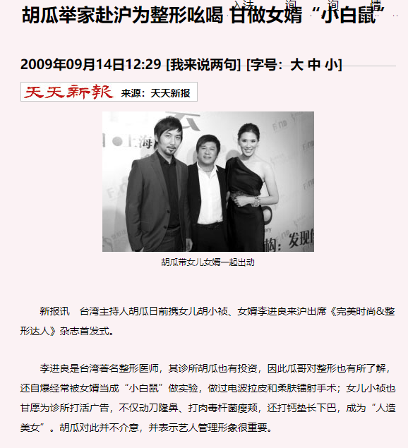 但在那感情最好的时候,胡瓜可是带着女儿亲身来上海帮女婿李进良的诊所打广告,小祯也为了丈夫不惜动刀隆鼻、打肉毒、垫下巴等。
