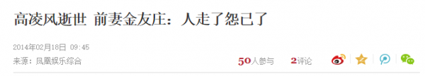 2014年,高凌风患血癌逝世。前妻金友庄对外界说:人走了怨已了。