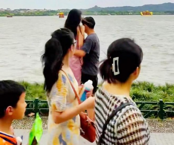 男子似乎没听见,但女友的脸上却有些挂不住,她试图将男子推开,但男子搂得太紧,似乎极为享受秀恩爱的过程。