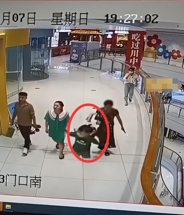 从商场的监控视频当中可以看到,一对年轻的夫妻领着一岁的孩子在正常行走,忽然身后应该老太太紧跟慢赶地尾随在身后,右手用塑料袋提着一个装水的水杯,目光一直盯着在前面走的一岁小男孩。