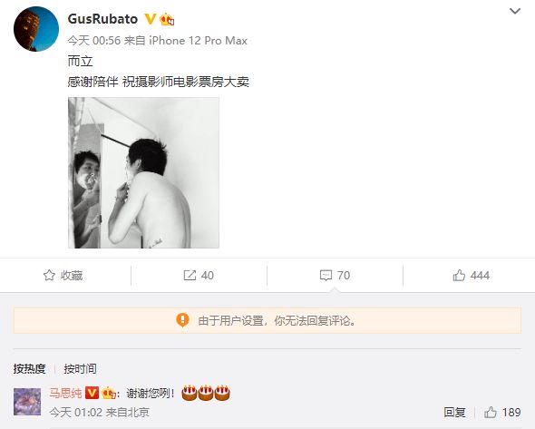 网易娱乐8月11日报道 8月11日,张哲轩发文为自己庆生,并为女友马思纯宣传电影,配文:"而立 感谢陪伴 祝摄影师电影票房大卖"。从张哲轩的表述中可知,这张照片是马思纯所拍摄。马思纯也现身评论区回复称"谢谢您咧!"还附上小蛋糕的表情。