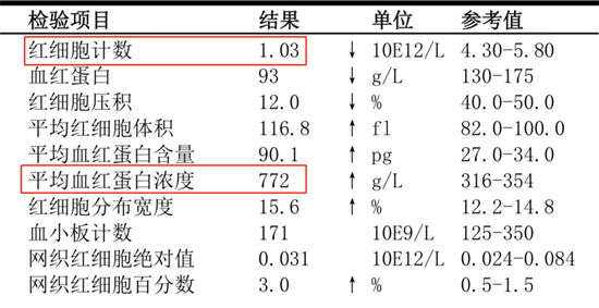 在萧大伯的检验报告中,每升血液中,含有的红细胞数量,只有1.03*10^12 ,而正常成年男性红细胞,一般在(4.30-5.80)*10^12/L,平均红细胞血红蛋白浓度,超标了一倍还不止。