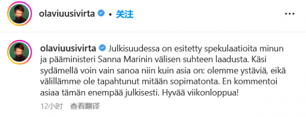 对于公众质疑两人的关系,奥拉维随后在社交媒体Instagram上回应称,他与马林是朋友,两人之间没有发生"不恰当"的事,自己不会再公开评论此事。