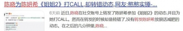 但是这次陈妍希参加《乘风破浪的姐姐2》,陈晓有过转发和支持,但是他好像喜欢发错了,发了陈妍希立志减肥的微博。