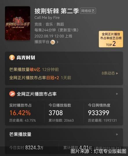 灯塔专业版显示,截至8月21日20时30分,《披荆斩棘2》已实现全网正片播放市占率两次登上单日综艺榜的日冠,舆情热度也在8月19日上线首日时登顶,而累积播放量则达到了4.01亿次,其中8月20日的播放量更是实现约1.5亿次。