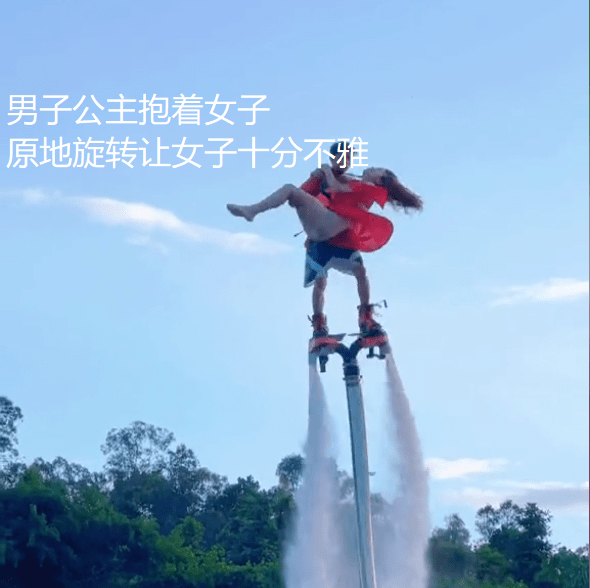 就这样体验了一会之后,这位男子直接将女子公主抱起来,然后就又在空中旋转起来。