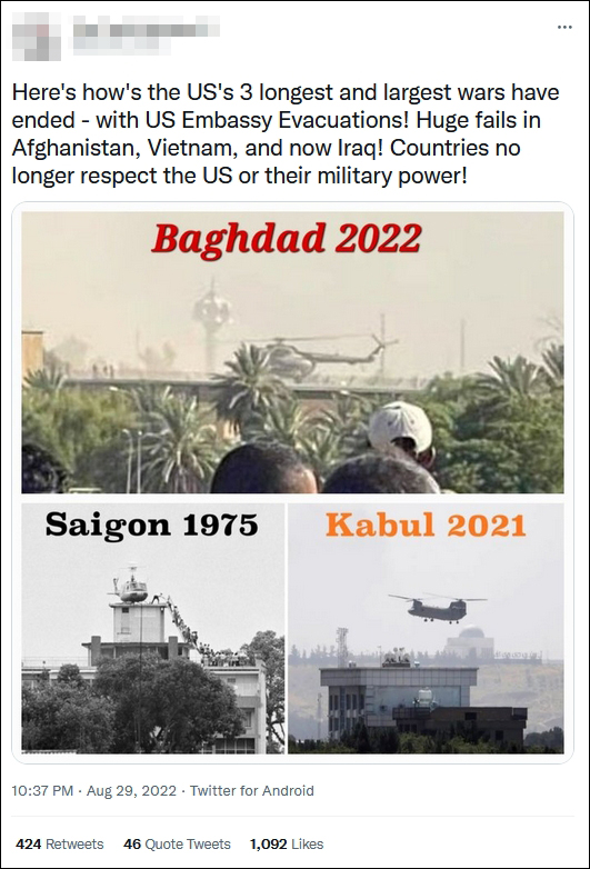 这一幕让人觉得似曾相识。有网友随即将这一场景与去年美军仓皇撤离喀布尔以及1975年美军"西贡时刻"的旧照进行对比,有关美国官方下达疏散令的流言也开始流传起来。