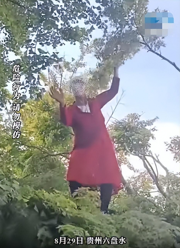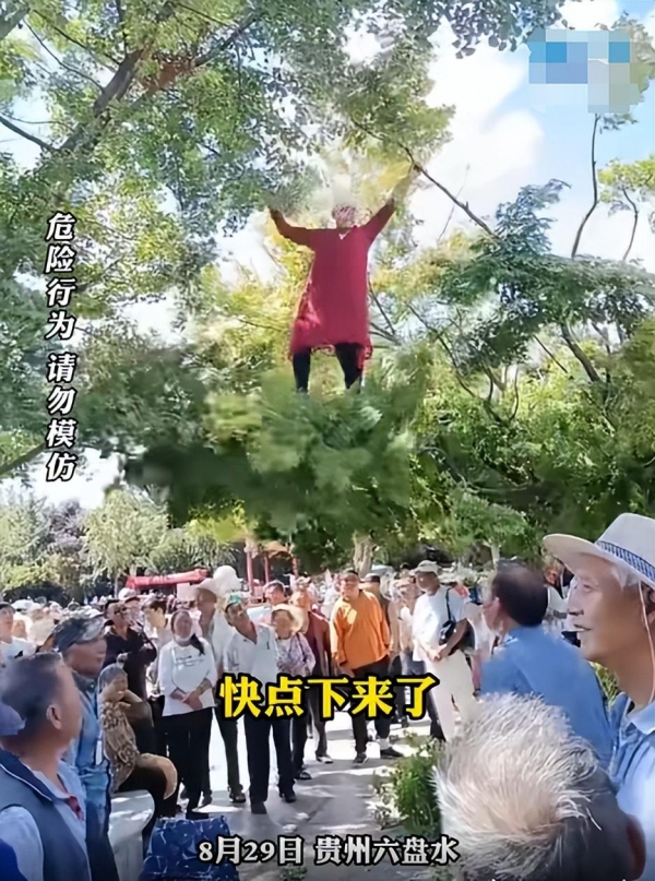 8月29日,在贵州六盘水某公园内,就有一位中年大妈抓住了机遇,自己爬上一棵大树上,竟然扒着树枝在翩翩起舞,期间吸引了很多的群众围观,愣是谁劝她都不下来。