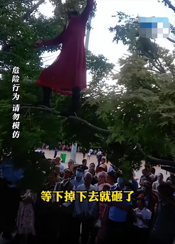 四川宜宾一位网友称:"树枝一断就是另一个故事了,既然大妈自己不想活了,就由着她在上面跳舞吧。上去容易下来难,这么多人围观大妈都不好意思说自己下不来了。"