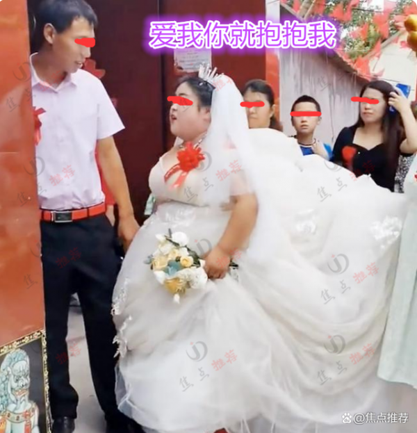 有网友分享了一段结婚的视频,在视频中,一名白白胖胖的新娘,在要出门的时候,突发奇想,想考验一下男友的体力,就提出让男友抱抱自己的要求,而且要求公主抱,新郎表示办不到,新娘表示"爱我你就抱抱我",不然我就不走了,看你和谁结婚