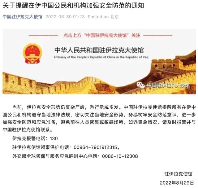 中国驻伊拉克大使馆:当前,伊拉克安全形势仍复杂严峻,游行示威多发。中国驻伊拉克使馆提醒所有在伊中国公民和机构遵守当地法律法规,密切关注当地安全形势,进一步加强安全防范和应急准备,避免前往人员密集或敏感场所。如遇紧急情况,请及时报警并与中国驻伊拉克使馆联系。
