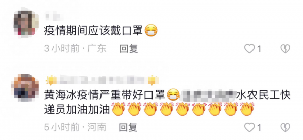 此外,还有网友提出质疑,觉得黄海冰为网红站台的行为有些掉价,而且给快递小哥送矿泉水时,也应该戴好口罩。