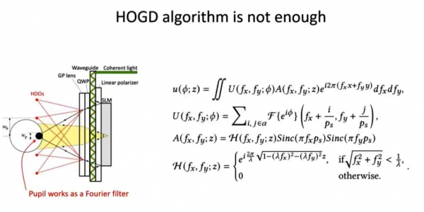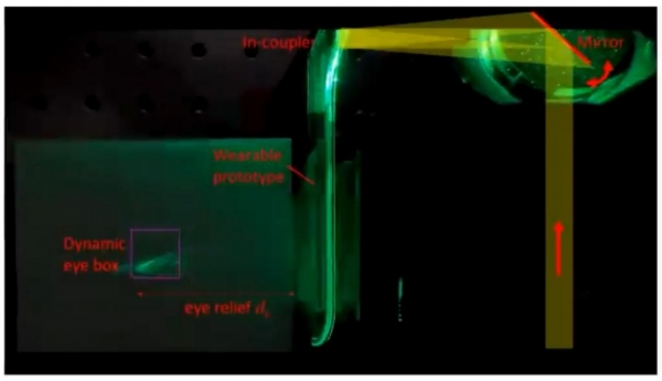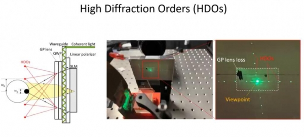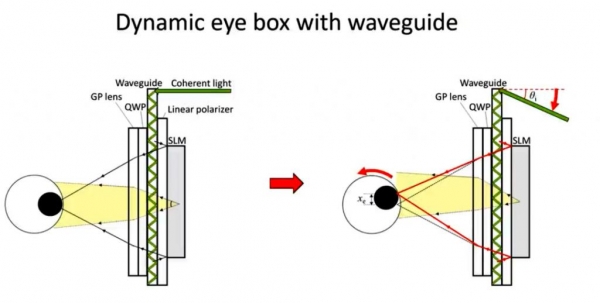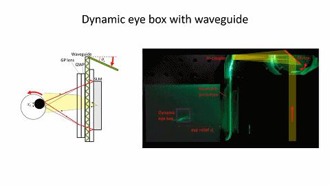 由于波导被设计用来再现具有一定范围的瞬时光角的光场,所以整个 SLM 照明的方向可以由输入光束的方向控制。有了额外的栅极跟踪器,系统可以跟随注视,并通过简单地改变输入光束的方向来围绕视点移动。