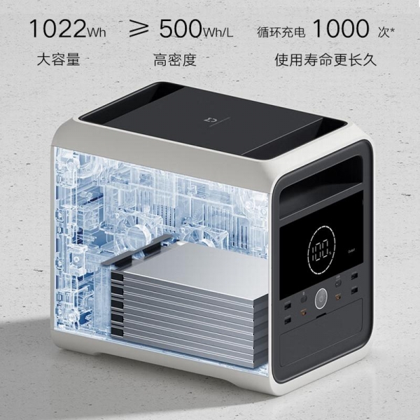 米家户外电源 1000Pro 电池组创新性地采用了"混合固液电解质锂电池",电池组仅使用了 10 块方形单体电芯 PACK 而成,电池组总电芯数量大幅度减少,一致性与电池管理更方便。单体电芯容量达到 28Ah,10 块总容量就是 280Ah,以 3.65V 电压平台计算的话,总能量就是 1022Wh。