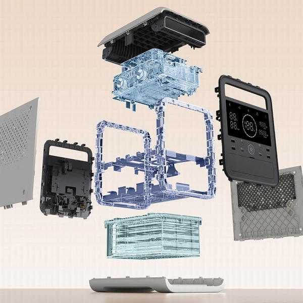 米家户外电源 1000Pro 内部采用"笼式框架结构"的设计概念,主体骨架采用环形铝合金框架与冲压钣金件组成,有点类似汽车发动机舱的龙门架结构,在尽可能轻量化的前提下,打造出更坚固且耐冲击的主体结构。