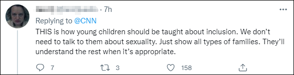 "好吧,我的孩子不会再看这个了。我不反对一个人作为成年人的个人选择,但你们不应该试图教我的孩子们去相信一些成年人的个人选择,并告诉他们在成长过程中可以把这些选择作为一种选项……"
