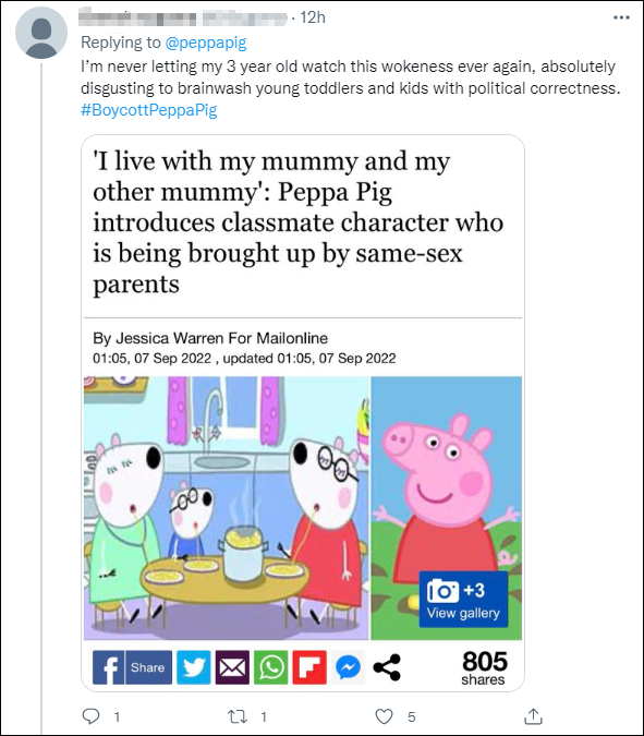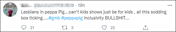 "《小猪佩奇》里出现了女同性恋……难道儿童动画就不能只给孩子看吗,所有这些都是几乎没有实际用处的官僚程序……说《小猪佩奇》包容性的就是在胡说……"