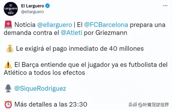在马竞看来,继续这样使用格列兹曼,明年夏天就能将法国巨星退回巴萨,不用执行买断条款。不过,巴萨不这么认为。塞尔电台透露,巴萨备好诉讼材料,准备将马竞告上法庭。