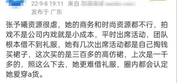 9月8日,有八卦媒体账号爆出张予曦资源很差,连出席活动都借不到礼服,甚至花300元买高仿裙,此事引发了网友的热议。