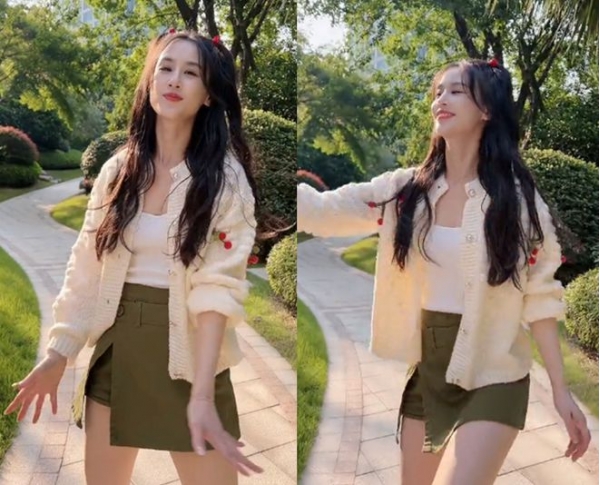从黄圣依晒出的视频中可以看到,黄圣依在某小区楼下兴致勃勃地跳起舞蹈,只见她身穿一件白色毛衣搭配军绿色的超短裙,显出她又细又长的一双美腿,让人移不开眼。整个人透露着一种骨感美,全身没有一丝赘肉。