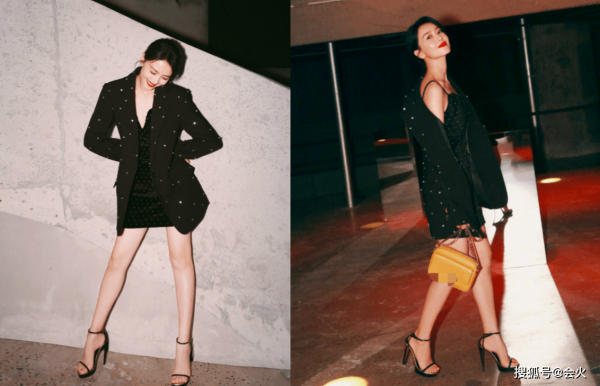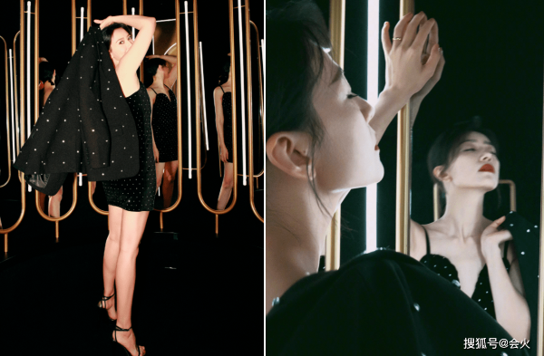 当晚高圆圆身穿黑色波点深V吊带短裙,配一双同色系高跟鞋,一双大长腿在闪光灯下格外白嫩。高圆圆将黑色外套随意搭在肩上,闭着眼睛神情慵懒,镜子里显现出其完美精致的锁骨,脸部下颌线极为优越。