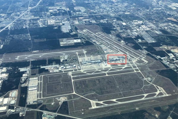 2021年的休斯顿乔治·布什机场,红框为上图中1969年建成的两个原始航站楼(资料图)