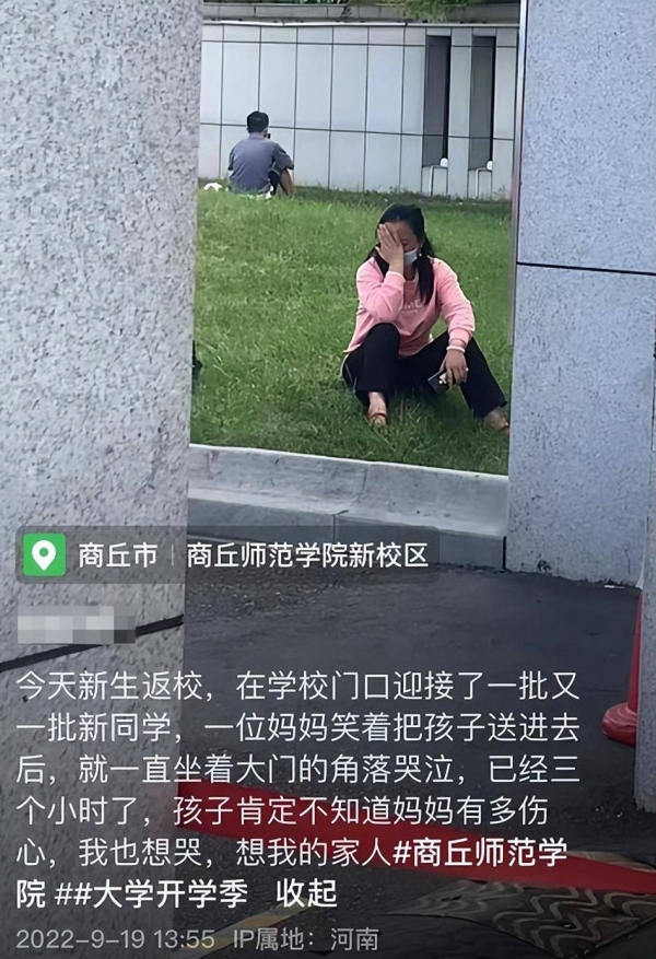 拍摄者王老师表示,妈妈送孩子的时候高高兴兴的,孩子进去后她蹲坐在角落一直在擦眼泪,待了3、4个小时才站起来,天都黑了,她也是一名母亲,当时特别揪心,感受到了儿行千里母担忧。