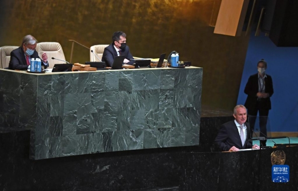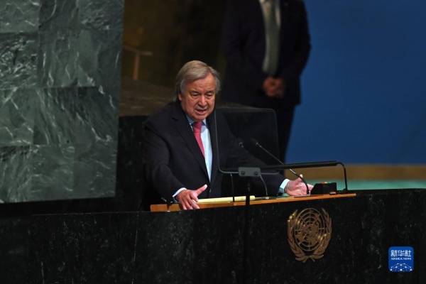 9月20日,在位于纽约的联合国总部,联合国秘书长古特雷斯在第77届联合国大会一般性辩论开幕式上致辞。新华社记者李睿摄