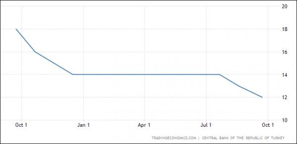 今年前七个月,土央行维持住了14%的基准利率不变。到了8月18日,土耳其年内首度下调100个基点,将基准利率从14%降至13%。34天后的今日,土耳其迎来了年内第二次降息,而12%的利率也低于大部分市场预期。