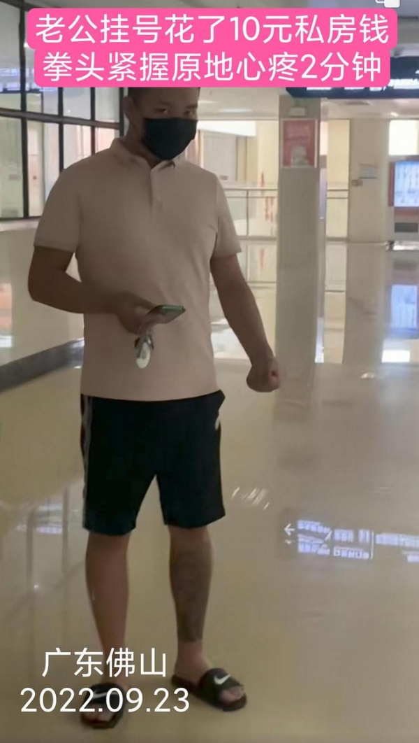 9月23日,广东佛山,一对夫妻去医院看病。医院挂号的人很多,妻子不愿意排队,就让老公去挂号,可老公却迟迟挪不动脚步。妻子以为老公不愿意去排队,就有点生气,觉得这老公也太不懂得体贴妻子了。